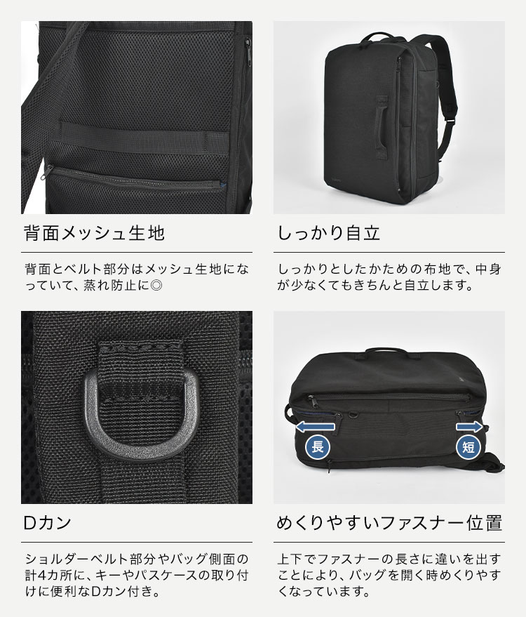 1泊2日の荷物をリュック一つでスマートに。キャリーケースと同じ開き方で中身を一望できるため、荷物が取り出しやすい。大きなメッシュポケットは、荷物を可視化。荷物が少なくても型崩れせず、自立する設計はどんな時もスタイリッシュ。ビジネスにも旅行にもマッチするスタイリッシュなアイテムです。