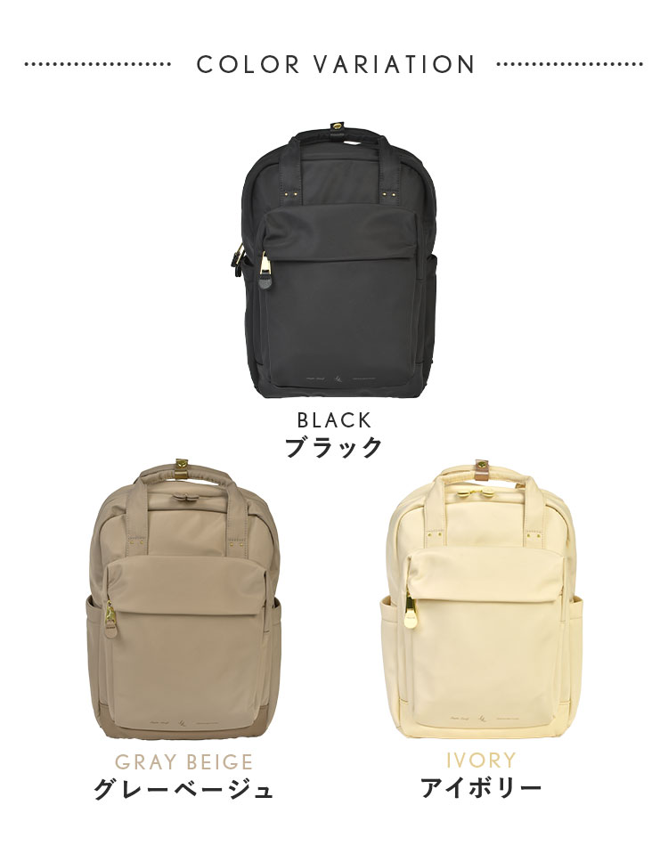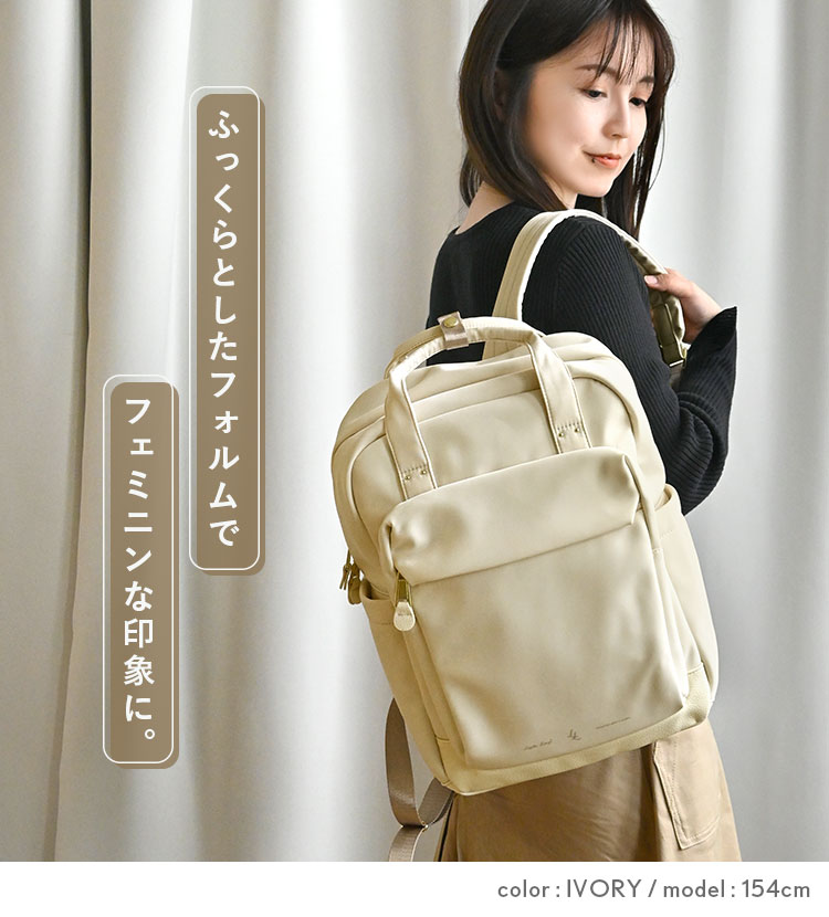 ふっくらしたフォルムでフェミニンな印象のフラッフィーシリーズ。ポイント使いの合皮パーツや同系色のロゴラバープリント、ゴールドの金具で洗練された雰囲気に仕立てられています。通勤・通学にも普段使いにもぴったりなリュックサックは両面撥水生地を使用しているので雨の日でも安心!仕分けがしやすい10個のポケット付きで小物の整理整頓も◎メインポケット内はPCやA4クリアファイルにぴったりなオープンポケットと、水筒やペットボトルにちょうどいいドリンクポケット付き。シンプルなデザインでカジュアルにも綺麗めにも合わせやすいリュックサックです。