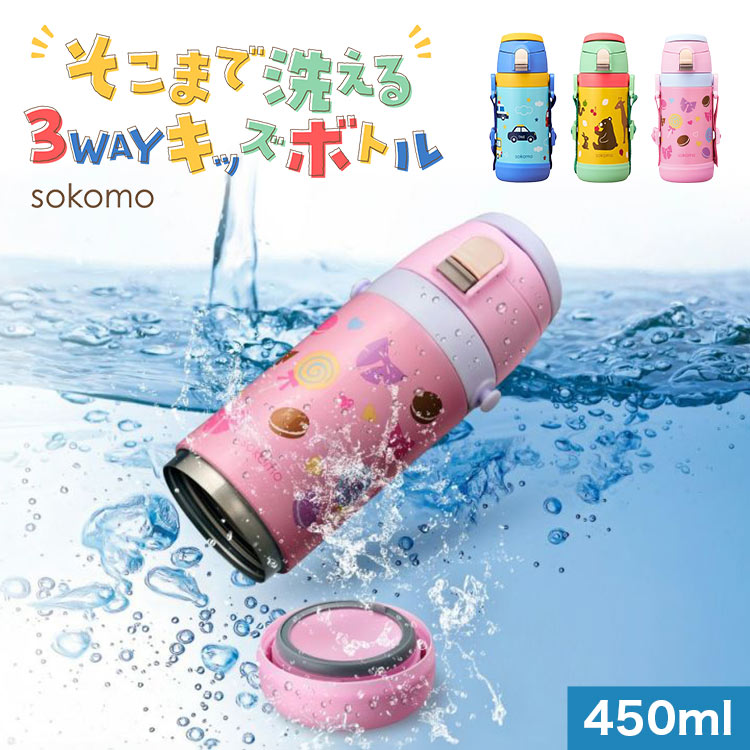 水筒 キッズ 450mL 保冷 保温 直飲み ストロー コップ そこまで洗えるボトル ソコモ sokomo ドウシシャ DOSHISHA かわいい ステンレス ボトル 男の子 女の子 底 洗いやすい カバー付き 3way 子ども 幼稚園 保育園 斜めがけ 真空二重構造 軽量 分解できる 魔法瓶 ボトル 肩紐