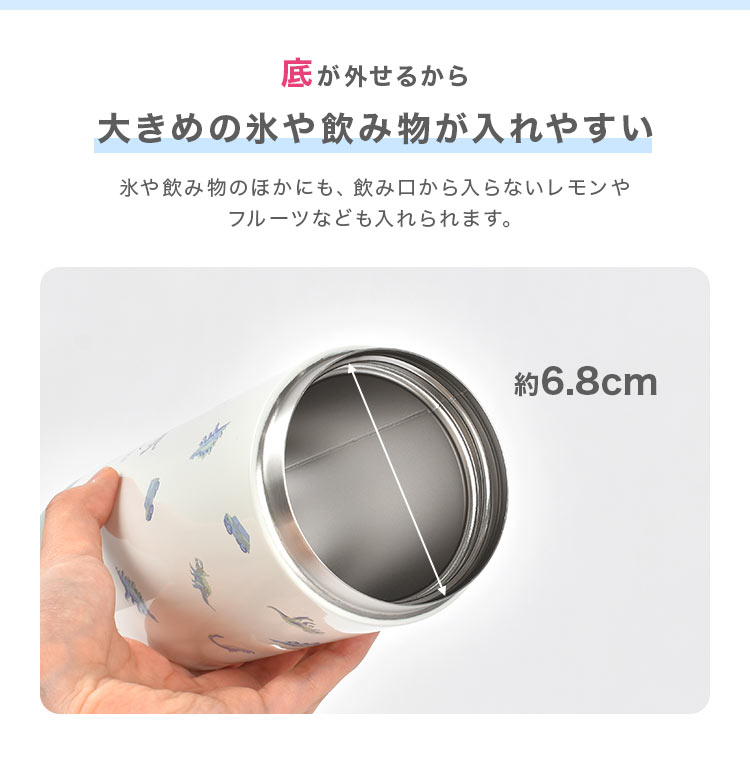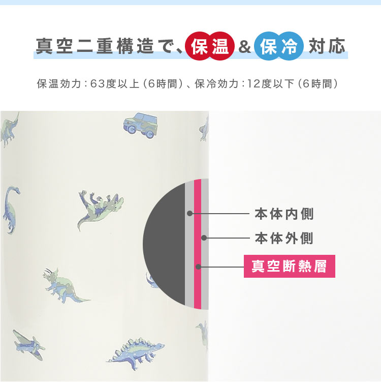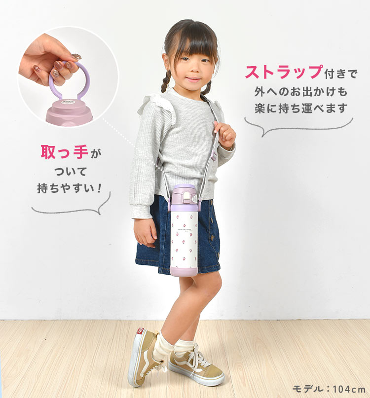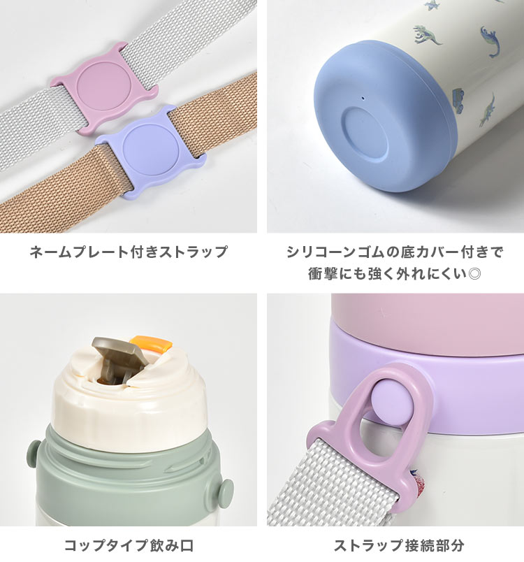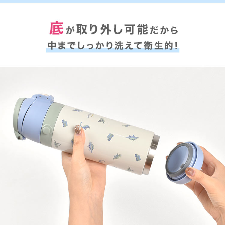 底部分も外れるので中を隅々まで洗いやすく衛生的な600mL子供用水筒。くすみカラーのイチゴと恐竜柄がかわいい!広口設計なので飲み口から入らない大きめの氷も入れることができます。保温・保冷機能に優れたステンレス素材で飲み物の温度を長時間キープ。取手付き、斜めがけできるショルダー付きなので外出時や通園・通学の移動もラクちんです。