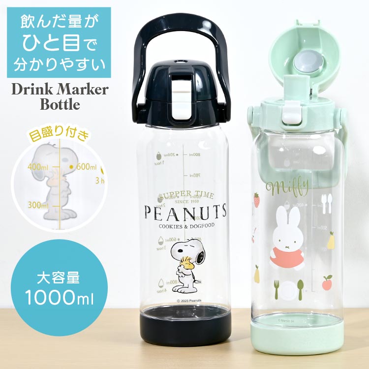 水筒 時間 目盛り 付き スヌーピー ミッフィー キッズ 直飲み 1リットル 女の子 男の子 子供 ドリンクボトル ウォーターボトル クリアボトル 透明 1l 大容量 軽量 広口 洗いやすい 持ち手 ロック付き ワンプッシュ おしゃれ かわいい 中学生 小学生 高校生 遠足 学校 部活