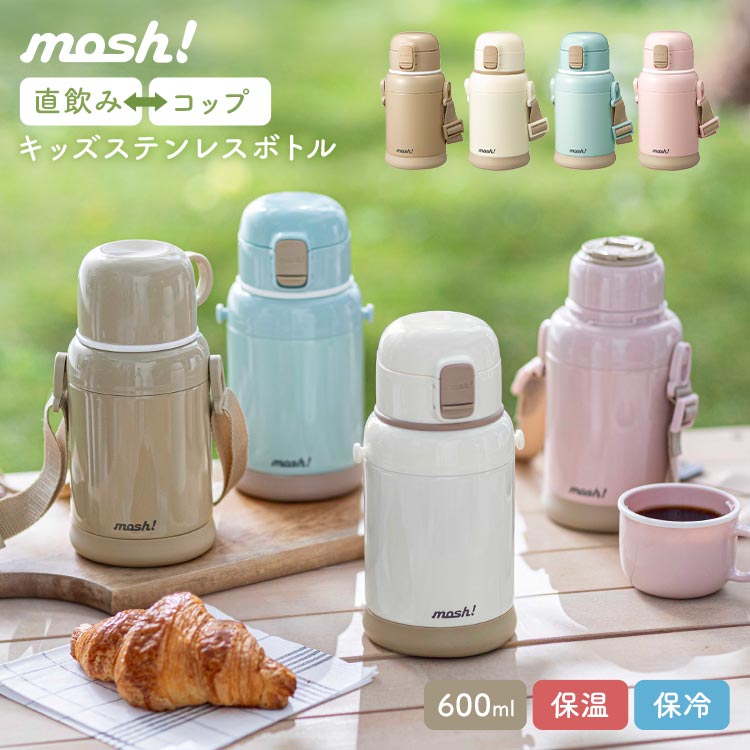 子供 水筒 ステンレス コップ 直飲み 2way mosh モッシュ 女の子 男の子 子ども キッズ 保育園 幼稚園 コップ付き水筒 600ml 保温 保冷 魔法瓶 洗いやすい ワンタッチ 斜めがけ ストラップ おしゃれ かわいい DOSHISHA ドウシシャ シンプル ブラウン ベージュ ミント ピンク