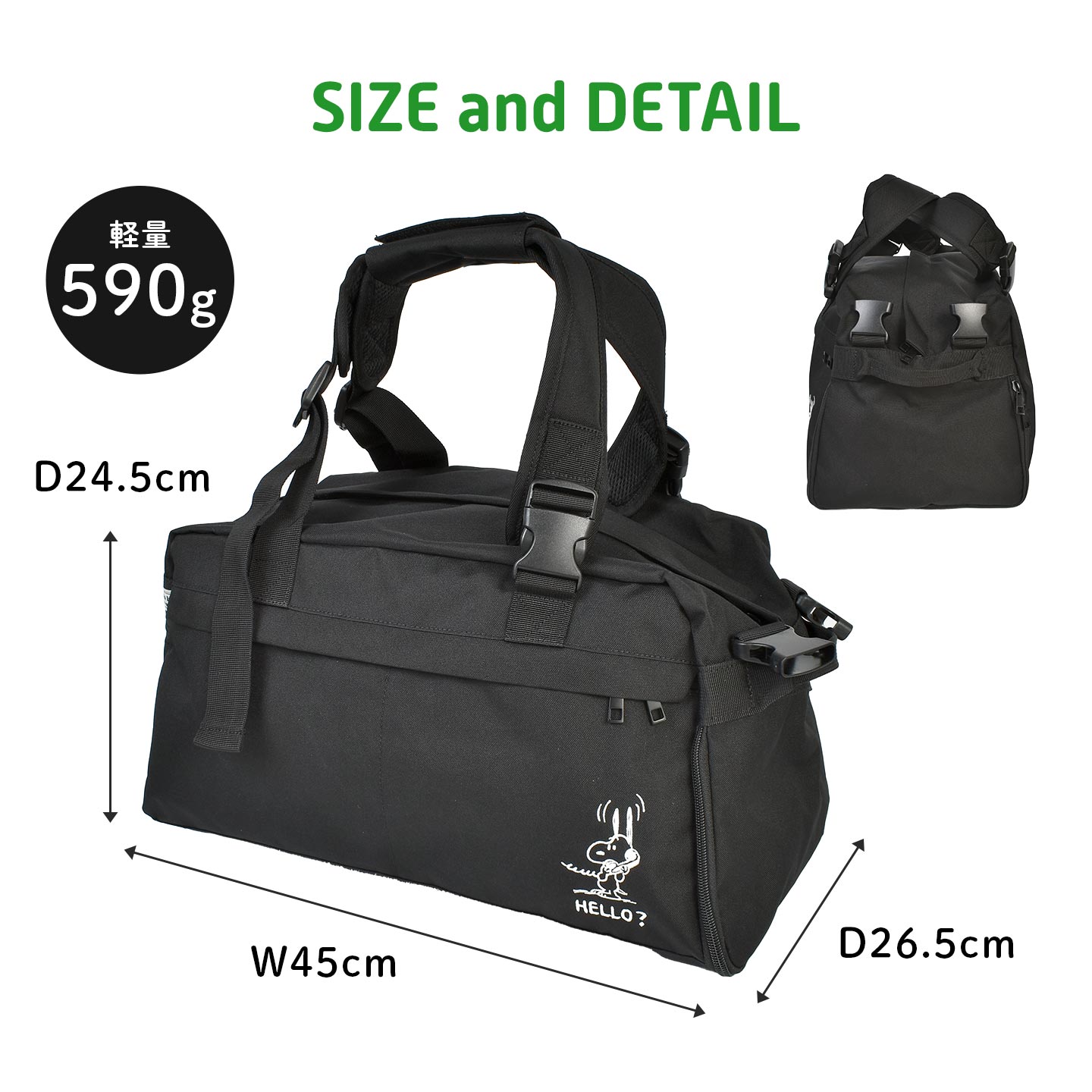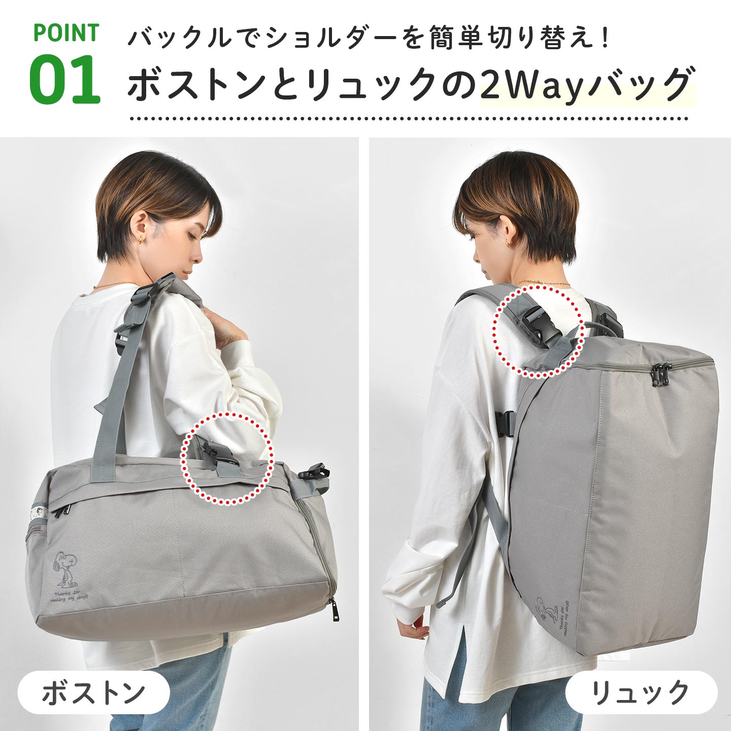 スヌーピーのワンポイント刺繍がかわいい♪ショルダーの位置を付け替えてボストンバッグとリュックサックの2Wayで使えるトラベルボストンリュック。