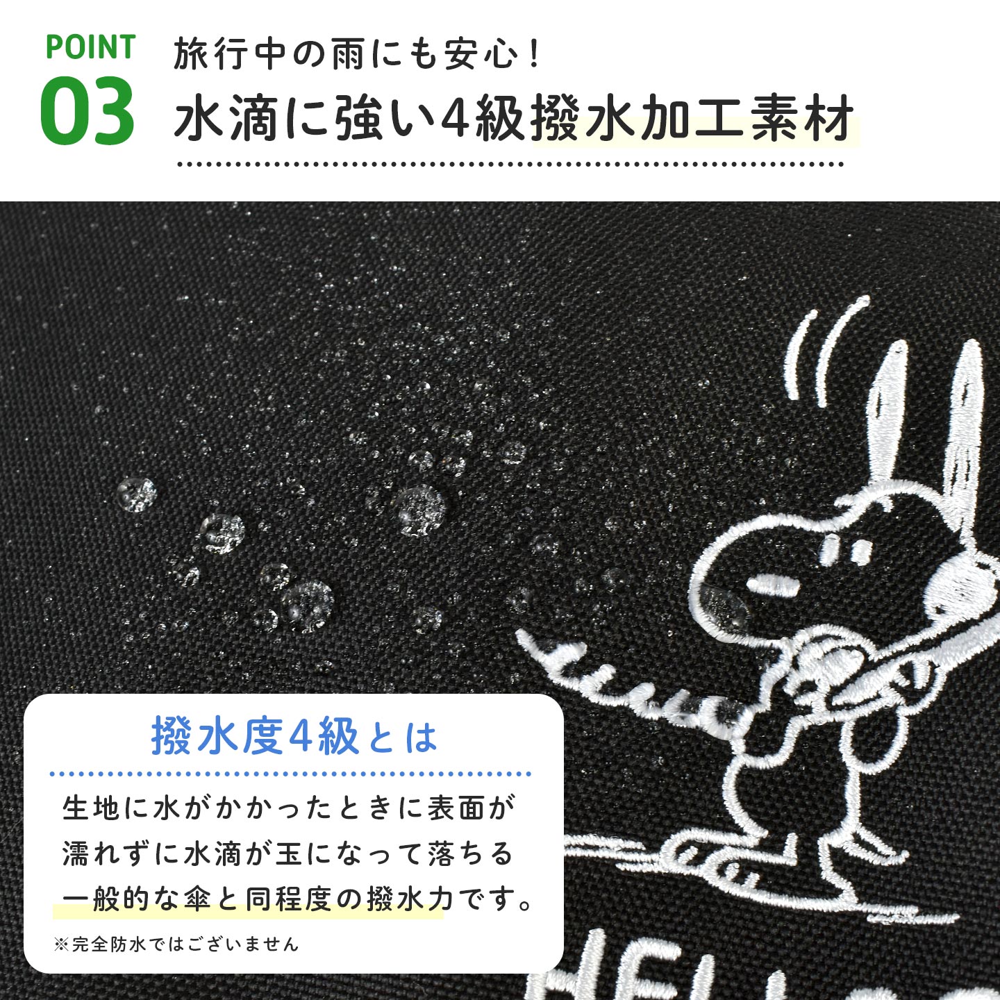 一般的な雨傘と同程度の4級撥水加工がされており、突然の雨から荷物を守ります。