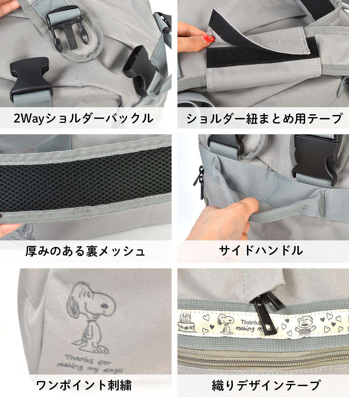 スヌーピーのワンポイント刺繍がかわいい♪ショルダーの位置を付け替えてボストンバッグとリュックサックの2Wayで使えるトラベルボストンリュック。 ショルダー位置を付け替えることでボストンバッグとリュックサックの2Wayで使えます。 2日分の着替えやバスタオルなど、1~2泊分の荷物がしっかり収納できる大容量サイズ!修学旅行や部活の合宿にもおすすめのサイズです。 一般的な雨傘と同程度の4級撥水加工がされており、突然の雨から荷物を守ります。![]() 充実した10個の仕分けポケットで荷物を整頓。![]() ![]() ![]() ![]() ![]() ![]()