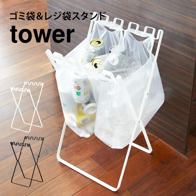 ゴミ箱 山崎実業 ゴミ箱&レジ袋スタンド タワー tower キッチン 分別 ダストボックス 折りたたみ 折り畳み ゴミ袋スタンド ごみ箱 コンパクト ホワイト ブラック 白 黒 台所 レジ袋スタンド ペットボトル 缶 7908 7909 45L 30L スリム 省スペース キッチン雑貨
