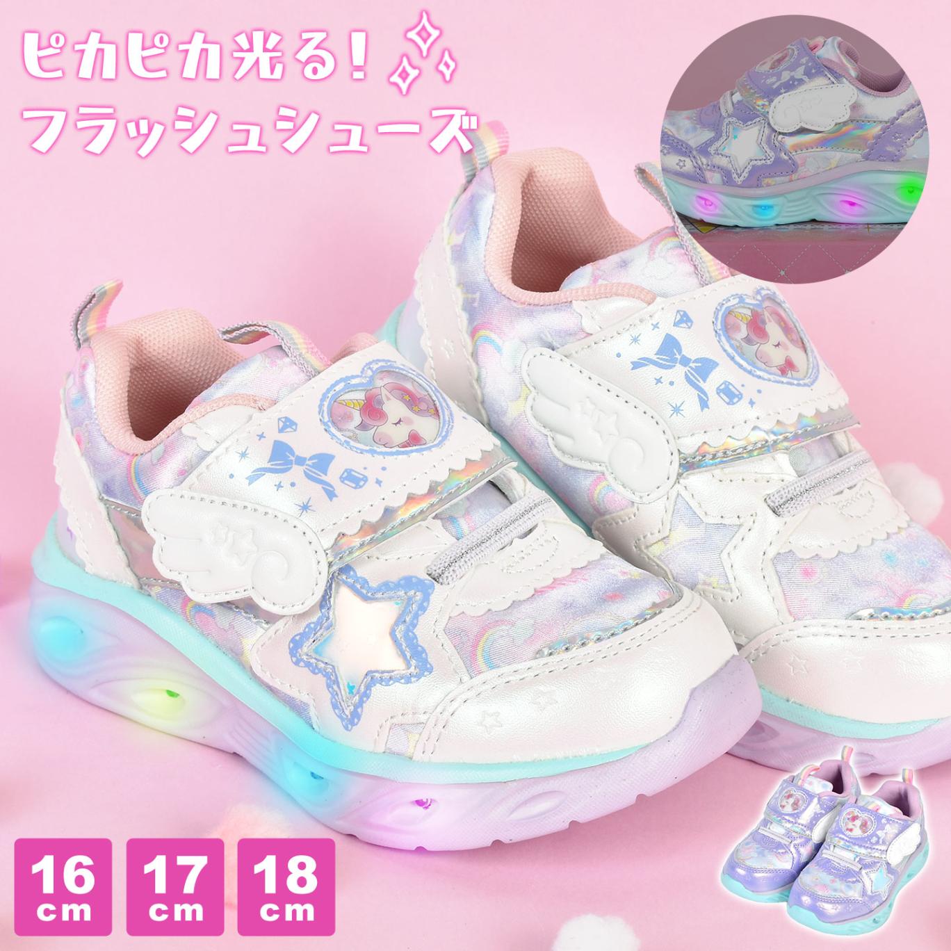 スニーカー キッズ 子供靴 女の子 光る靴 Double Star ダブルスター 16cm 17cm 18cm 軽量 運動靴 シューズ おしゃれ 可愛い 柔らかい 幼稚園 保育園 3歳 4歳 5歳 6歳 プレゼント 白 ホワイト パープル ユニコーン オーロラ レインボー キラキラ ピカピカ