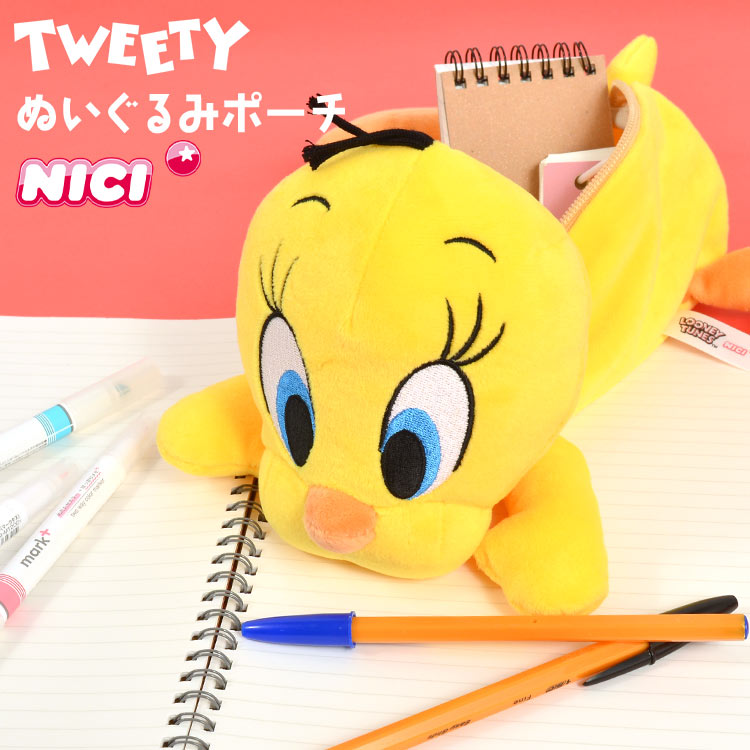 トゥイーティー ペンケース ぬいぐるみ ポーチ NICI ニキ 高校生 女子高生 レディース かわいい 大容量 小物入れ 筆箱 学生 フィギュアポーチ キッズ 女の子 海外 アニメ キャラクター 子供 大人 おしゃれ おもちゃ プレゼント ギフト 動物 アニマル 鳥 ひよこ メイクポー