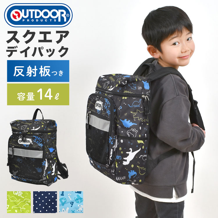 リュック キッズ 女の子 男の子 アウトドア プロダクツ OUTDOOR PRODUCTS 子供 スクエア リュックサック キッズリュック 大容量 軽量 丈夫 14L 小学生 低学年 中学年 子ども 通学 通園 幼稚園 塾 習い事 遠足 黒 緑 紺 水色 恐竜 ドット アルファベット カラフル ブラン